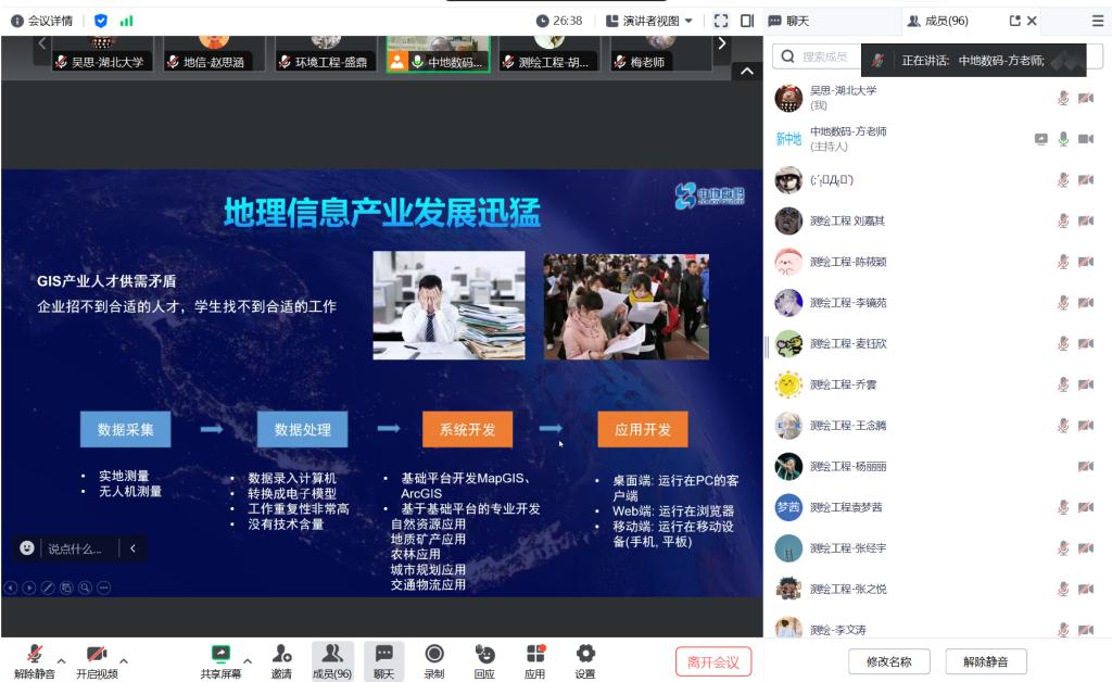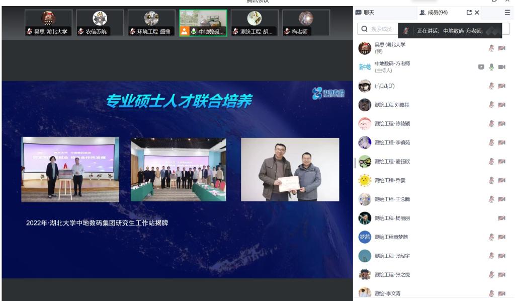 为进一步深化校企合作,推进产学研一体化发展,共同培养复合型、创新型人才。2024年4月29日,公司和中地数码集团联合举办举行了一场别开生面的线上专业硕士联合培养交流会,本次会议由中地数码集团/新中地教育教研主任方胡朝主持,公司代理副经理刘杰教授、工作站负责人梅新教授、研究生秘书吴思及公司部分2024级硕士研究生新生参会。