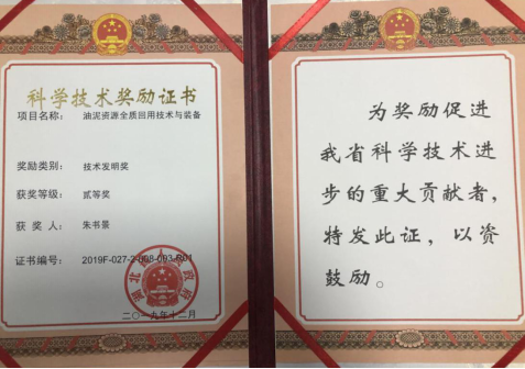 公司朱书景教授项目《油泥资源全质回用技术与装备》从2008年开始进行技术开发与攻关,于2012年进入装备工业化应用阶段,截止目前获得发明专利授权10余项,累计创效15.8亿元,有力的推动了我省含油污泥的处理与资源化水平提升。此次获得省技术发明奖将有力的推动该项技术进一步服务于我省乃至全国的含油污泥资源化处理。