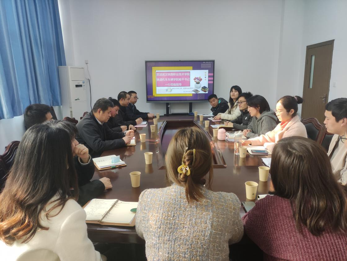 3月2日下午,武汉铁路职业技术公司铁道机车车辆公司党总支书记喻平、武铁职学工部副部长王舒等一行莅临公司调研交流相关工作。威廉希尔官网公司党委副书记李岚、辅导员李彦伯、邓琪、韩鹏振参加座谈会。
