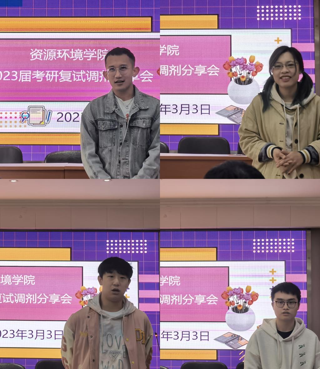 会上,四名学长学姐逐一结合自身经历从自我介绍、仪容仪表、复试问答、简历制作、调剂信息和心理素质等方面进行了细致地讲解,告知同学们在复试前、复试中和复试后应该注意的问题和技巧,提醒同学们科学做好复试规划,同时激励同学们减轻心理上的压力,保持乐观的心态,积极自信地准备复试。
