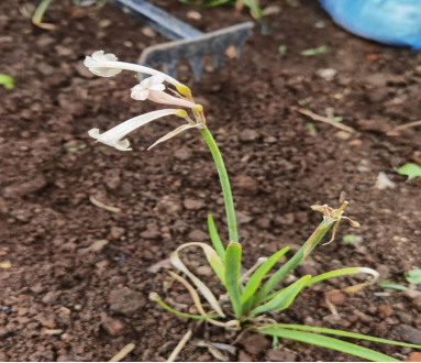 不一会儿的功夫大家就迅速进入状态,挖土、整平、把杂草连根拔起,时不时听见大家的欢声笑语,看见昆虫们活跃的身影,突然一声惊喜的声音传来“快看,它开花了!”此时,一株风雨兰上挂着的粉白色花苞在离开了杂草的遮挡后显露出来,它的出现让所有人脸上的笑容更加璀璨。