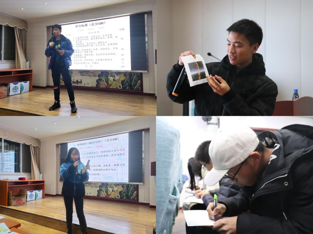 本次竞赛内容包括三项:主题演讲、简笔版画和你问我答。第一项主题演讲,8名参赛的同学逐一站在讲台上用亲身经验,分享着对地理的看法,分享着自己的生活,绘声绘色。自信而幽默的表现使得演讲更加生动有趣,并且引人深思。