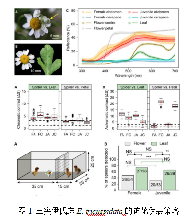 近几十年来,人们对蟹蛛在花朵上的伪装进行了广泛的研究,研究对象主要集中在体色统一的物种中。然而,隶属于7个科的50余种访花蜘蛛并不具备统一的体色。这些体色多态的蜘蛛在花上是否隐蔽,人们对蜘蛛在不同发育阶段所采用的访花策略知之甚少。本研究探究了一种头胸部与腹部颜色差异明显的蟹蛛三突伊氏蛛Ebrechtella tricuspidata在花上的伪装及访花策略,发现了其头胸部的可见性和腹部的隐蔽性,揭示了其不完美但有效的伪装。研究结果发现幼蛛与雌蛛在花上面临的捕食风险存在显著差异,结合之前长期的野外观察结果(花上的幼蛛显著多于雌蛛),推测不同发育时期的个体采用不同的访花策略:捕食风险更低的幼蛛,更多地出现在花上(图1)。