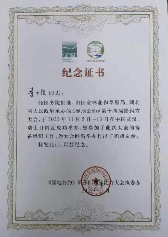 公司李中强教授参与筹备《湿地公约》第十四届缔约方大会 来源:威廉希尔官网发布时间:2023-01-15点击率: 《湿地公约》第十四届缔约方大会于2022年11月5日-13日在中国武汉、瑞士日内瓦成功举办。公司李中强教授参加了此次大会,并参与到大会的筹备组织工作中去,为大会圆满举办作出了积极贡献。 据悉,《湿地公约》第十四届缔约方大会经国务院批准,由国家林业和草原局、湖北省人民政府承办。党的十八大以来,在大力推进生态文明建设的背景下,湿地保护对人类发展意义重大,我们要进一步砥砺“三心”,保护湿地资源,守护我们栖居的美丽家园。 (撰稿人 李可;审稿人 刘杰)