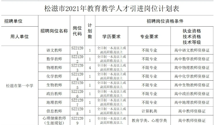 在松滋市2021年人才强市战略——“我选湖北·智汇松滋”计划中,公司计划引进:语文、数学、物理、化学、生物、政治、地理、信息、心理健康学科教师共12名。《松滋一中2021年公司产品人才引进岗位计划表》如下: